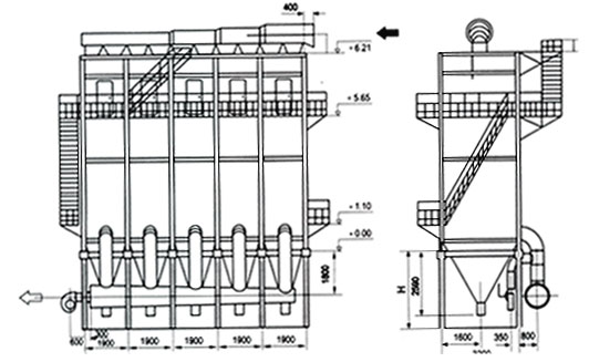 該設備由含塵氣體入口至凈化煙氣出口,本體結構由進氣管路、進氣室、袋室、灰斗、排灰閥、出口管道及反吹風系統和清灰控制系統所組成。