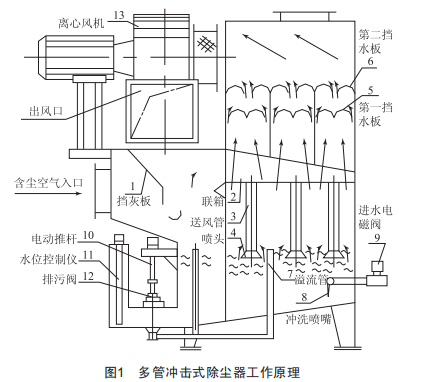 含塵氣體的整個過程是在負壓狀態下進行的,除塵風機安裝在出風管上。箱體內的液位高度由溢流閥控制,操作人員通過觀察水位計,將液位調整至距噴嘴口0-5mm處。